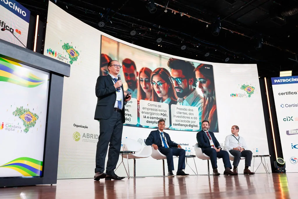 Durante a programação, a ANCD participou do painel “Confiança digital do futuro: computação quântica, deepfakes e os desafios da ICP-Brasil”, realizado no plenário principal. O debate foi moderado pelo diretor-executivo da associação, Edmar Araújo, e contou com a participação de Márcio Nunes, membro do Comitê Gestor da ICP-Brasil e conselheiro da ANCD, Pedro Pinheiro, diretor de Auditoria, Fiscalização e Normalização do Instituto Nacional de Tecnologia da Informação (ITI), e Giovani Pieri, analista de Tecnologia da Informação da Universidade Federal de Santa Catarina (UFSC).
