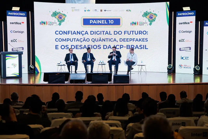 O painel abordou como a ICP-Brasil vem se preparando para os desafios futuros, como a computação quântica e os deepfakes. Pieri afirmou que o cenário é positivo e ressaltou que o ITI já está trabalhando em conjunto com a academia o tema da computação quântica, o que mostra que a ICP-Brasil busca se antecipar às mudanças que devem ocorrer nos próximos anos. Pinheiro apresentou dados sobre o uso atual dos certificados digitais e explicou que dois terços das emissões já ocorrem por videoconferência. Nesse contexto, as tentativas de fraude permanecem estáveis, mas estão migrando do presencial para o digital. Ele disse que o ITI está treinando uma inteligência artificial para ajudar no combate às fraudes, projeto que já passou pela fase de prova de conceito e deve entrar em funcionamento em maio de 2026. Segundo ele, essa é apenas uma das evoluções do ecossistema antifraudes da ICP-Brasil, que também avança na conferência de identidades em novas bases e na verificação contextual das emissões.